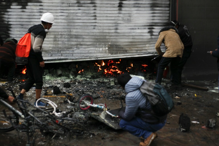 Supermarket workers inspect fire damage after street clashes in Puno, Peru, on January 9, 2023 © AFP / Juan Carlos CISNEROS